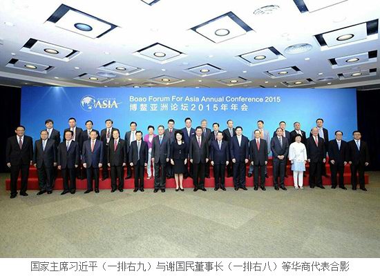 3月26-29日,博鰲亞洲論壇2015年年會(huì )在海南省博鰲舉行,本屆年會(huì )主題為“亞洲新未來(lái):邁向命運共同體”。3月28日,國家主席習近平出席了年會(huì )開(kāi)幕式,發(fā)表了題為《邁向命運共同體 開(kāi)創(chuàng )亞洲新未來(lái)》的主旨演講,并與正大集團謝國民董事長(cháng)等出席博鰲亞洲論壇2015年年會(huì )的華商代表合影留念。