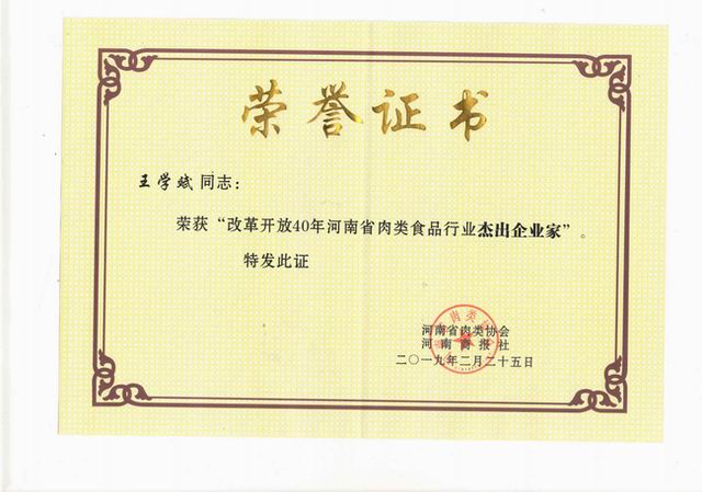 會(huì )議對勇立潮頭、扎實(shí)肯干、業(yè)績(jì)突出、有責任有擔當的先進(jìn)模范人物和規模大、實(shí)力強、信譽(yù)好的先進(jìn)示范企業(yè)進(jìn)行表彰:洛陽(yáng)正大榮獲改革開(kāi)放40年河南肉類(lèi)食品行業(yè)強勢企業(yè)稱(chēng)號,王學(xué)斌***總裁榮獲改革開(kāi)放40年河南肉類(lèi)食品行業(yè)杰出企業(yè)家!